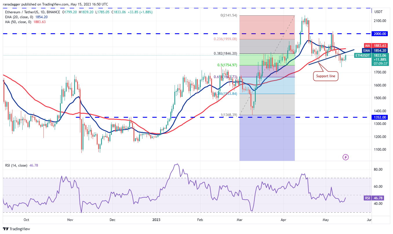 Ether (ETH) turned up from the 50% Fibonacci retracement level of $1,754 on May 12 and after a couple of days of consolidation, the bulls have pushed the price to the 20-day EMA ($1,854).