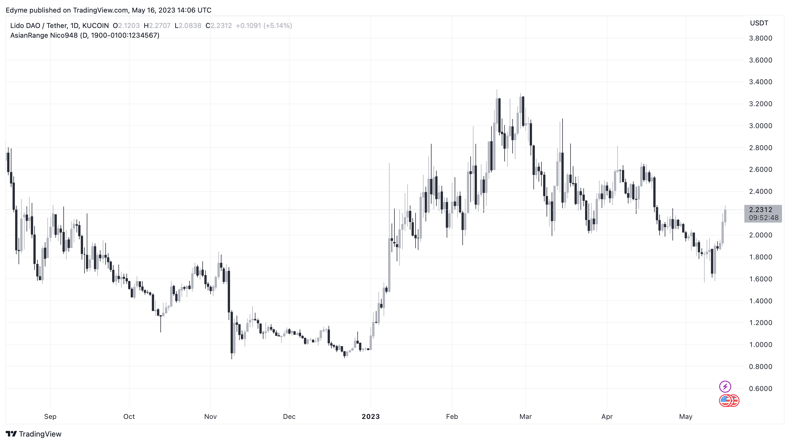 $LDO’s price has already risen nearly 20% since the upgrade, with a market currently above $2 at the time of writing. Alongside the price surge, Lido DAO’s market capitalization has also experienced a notable rise. The market cap moved from $1.4 billion last Friday to $1.9 billion today.