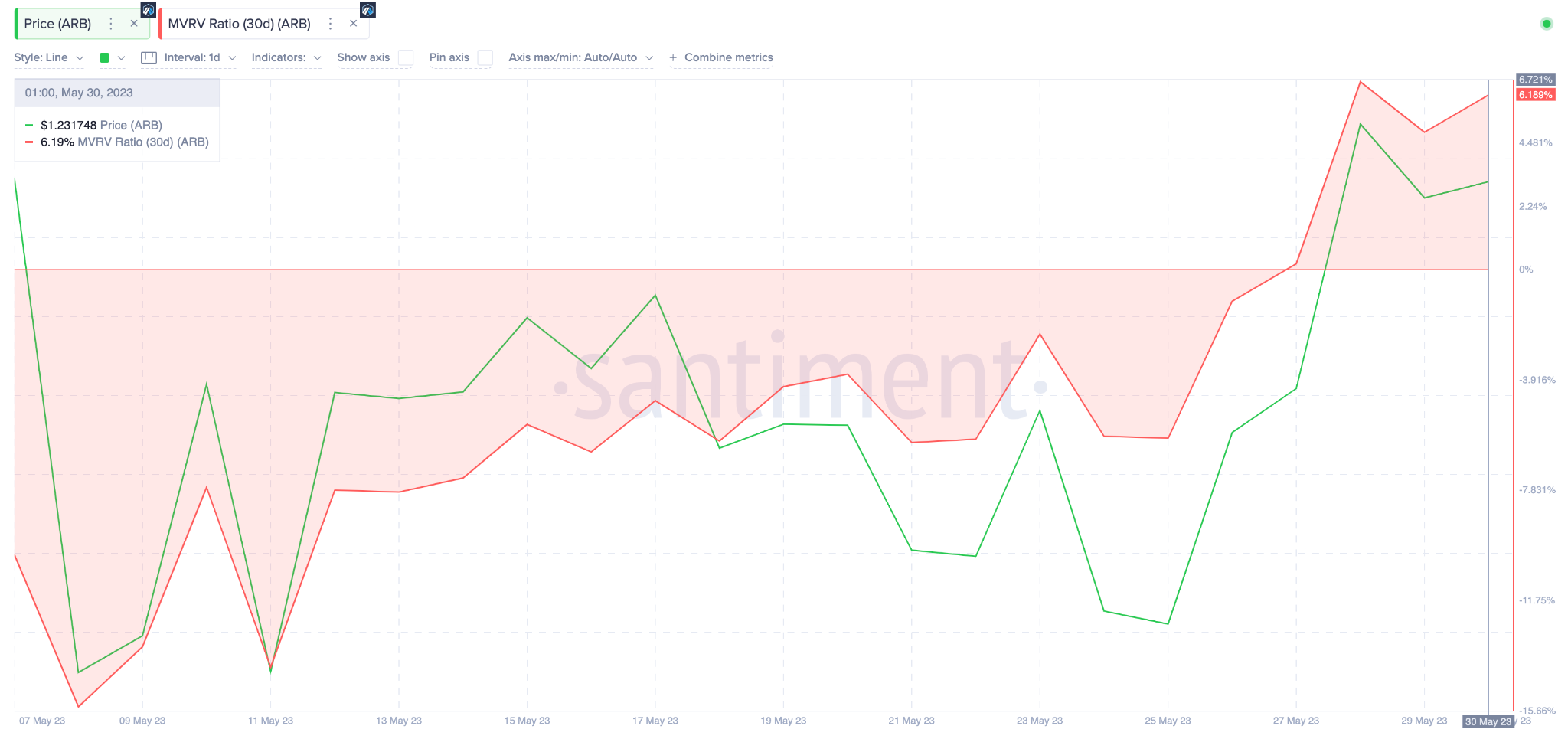 With prices currently sitting at $1.22, the Market-Value to Realized-Value (MVRV) data shows that crypto investors who bought $ARB within the last 30 days are holding unrealized profits of 6%.