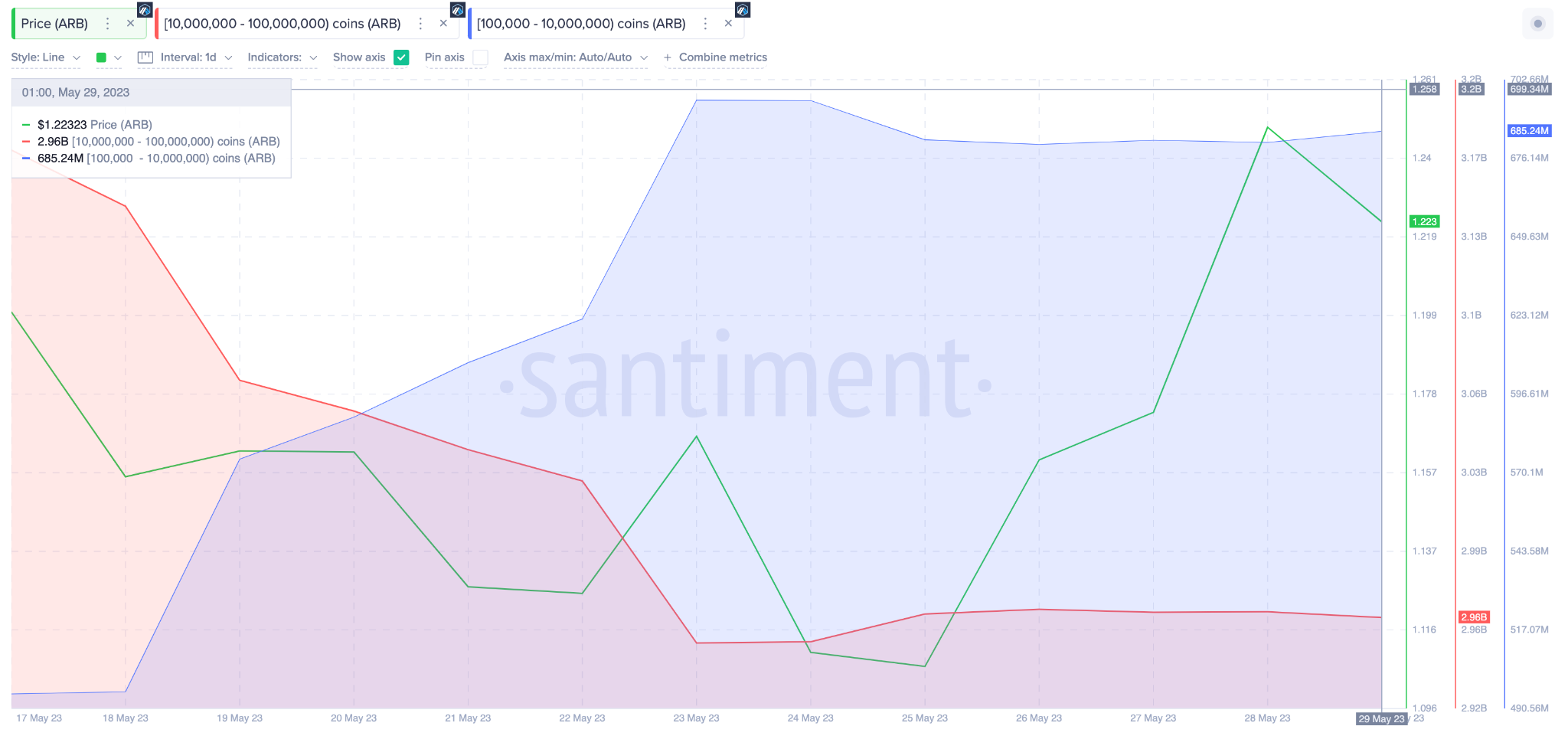 The chart below shows that the bearish whales (red) sold off 190 million tokens between May 18 and May 30. Meanwhile, the bullish whales (blue) bought 191.2 million $ARB tokens during the same period.