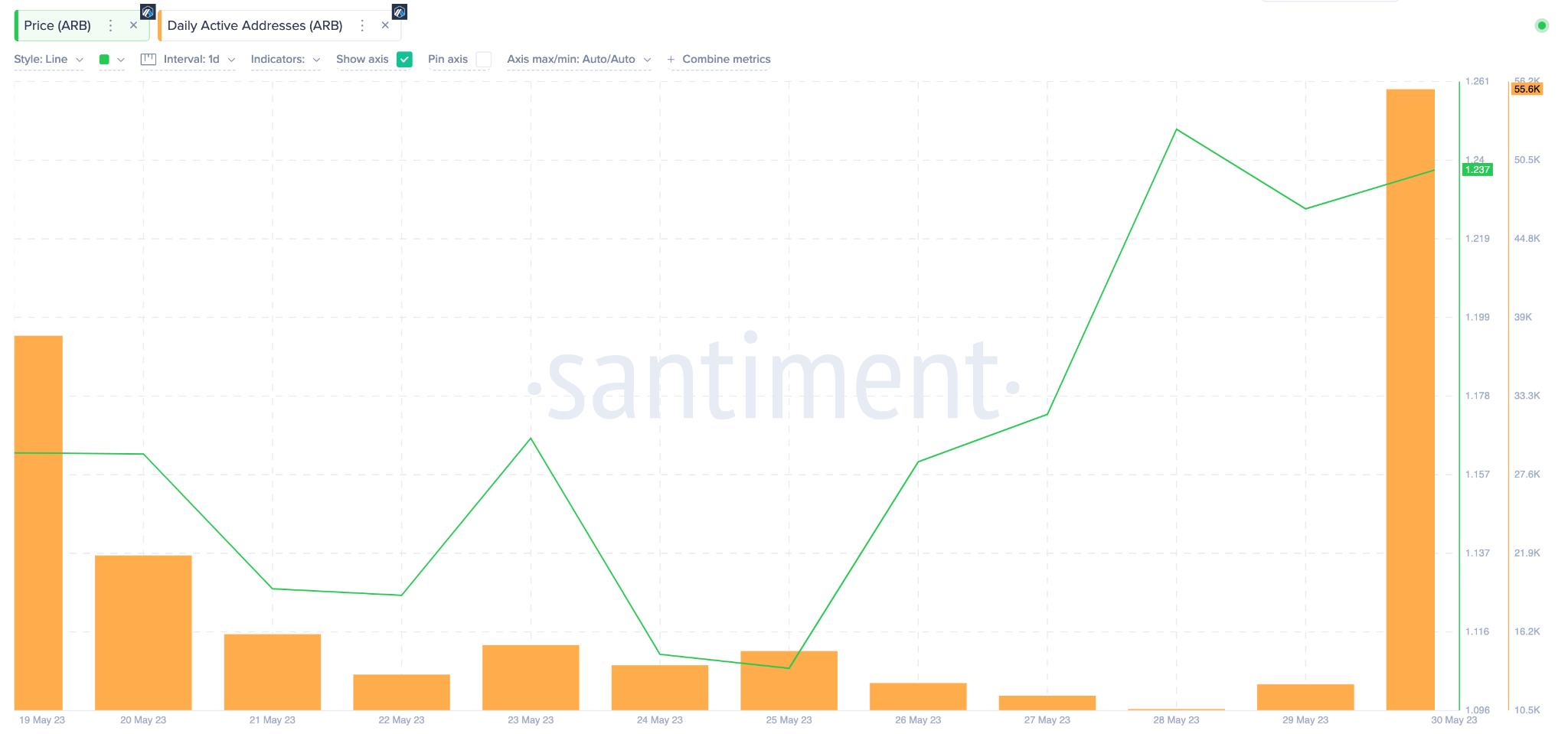 On May 30, Arbitrum recorded 55,700 Daily Active Addresses, a 350% increase from 12,400 recorded the previous day. Quite remarkably, it was even more than what was recorded in the previous four days combined.