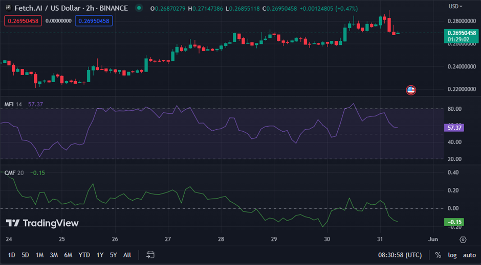 The Chaikin Money Flow (CMF) motion in the negative region with a value of -0.14 on the FETUSD 2-hour price chart implies that the bullish momentum may be losing pace.