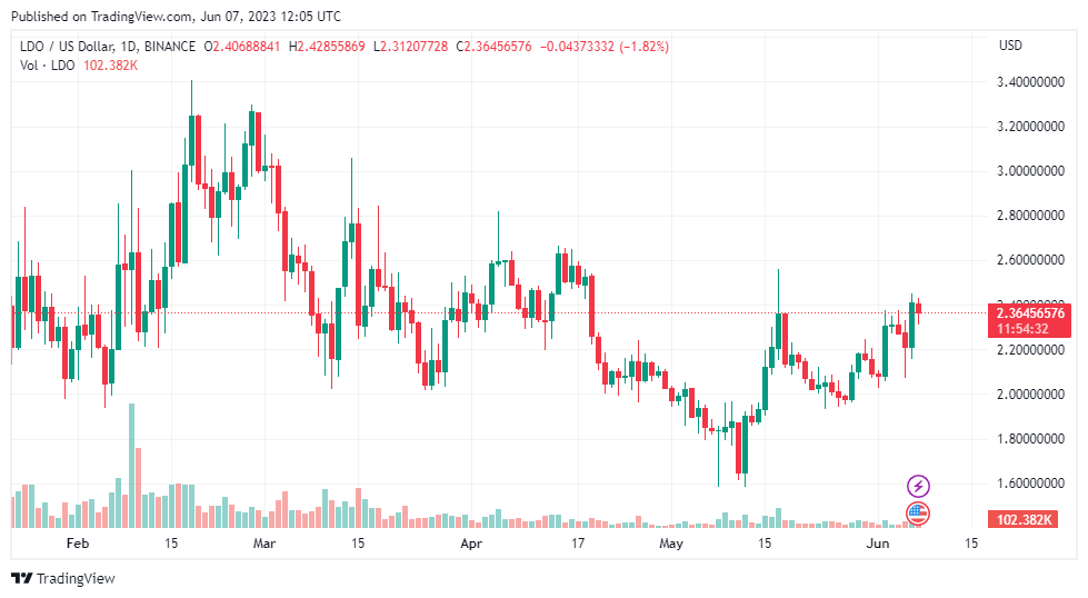 Lido DAO ($LDO) price gains today suggest the bulls are determined to push it to the $2.5 mark as the broader crypto market cap increased in the last day.