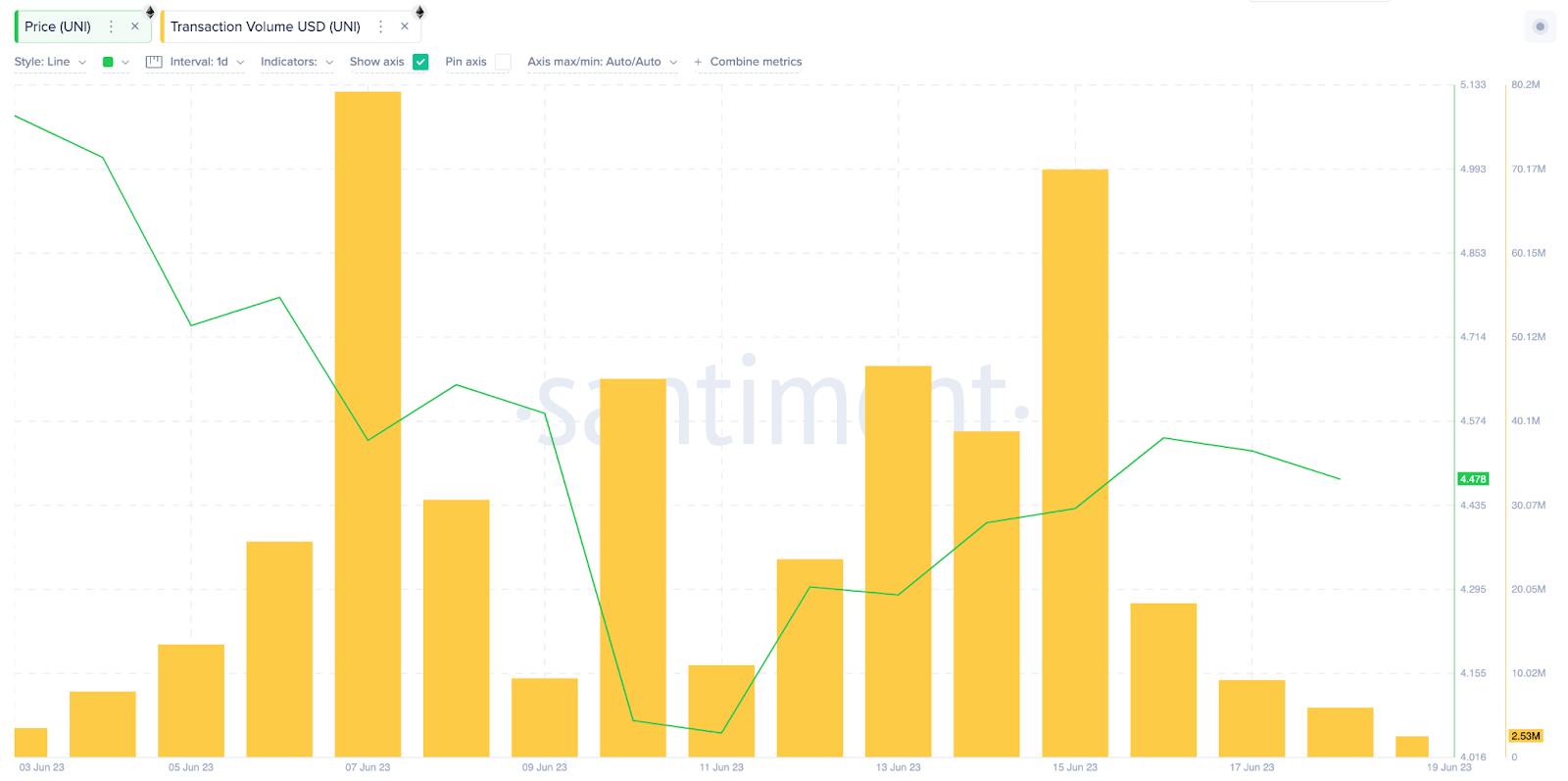 In confirmation of the bearish stance, Uniswap appears to be losing market share to its competition’s Decentralized Exchanges protocols. Between June 5, the SEC first announced its lawsuit against Binance and Coinbase, and June 7, UNI Transaction Volume quickly spiked 900%.