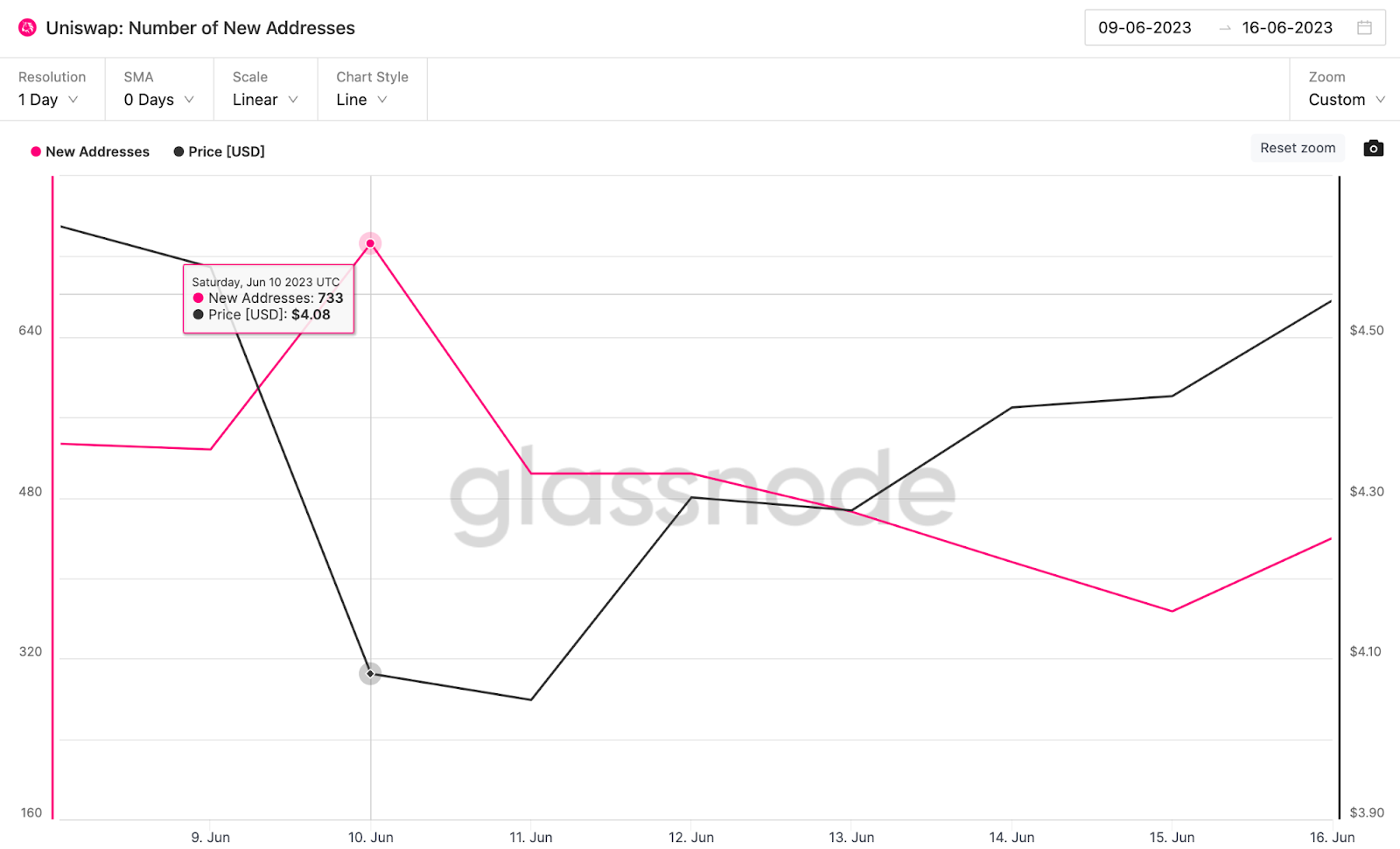 According to the data presented by Glassnode, UNI has been struggling to attract new demand since this week. The chart below illustrates that New Addresses created on the Uniswap network have declined since the recent high on June 10.