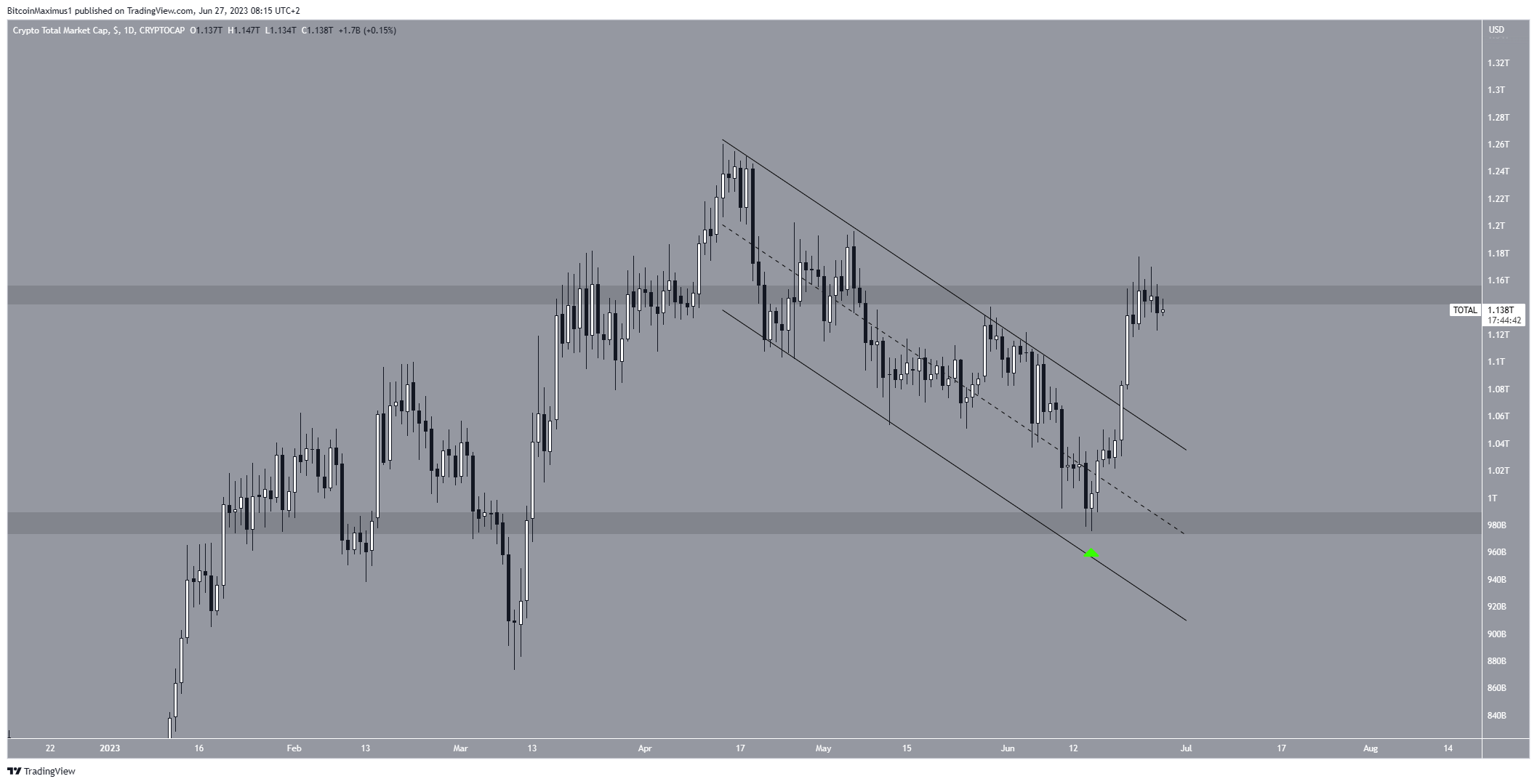 The TOTALCAP increased significantly since bouncing to the $980 billion level on June 15 (green icon). The increase caused a breakout from a descending parallel channel five days later, leading to a high of $1.17 on June 23. This took to the price to the $1.15 trillion resistance area.