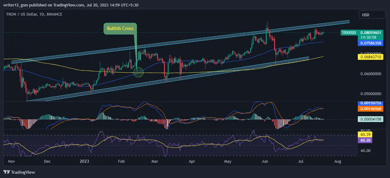 The crypto price of TRON. has climbed beyond the 50 and 200-day moving averages in the weekly chart, indicating strong bullish momentum. The market is optimistic about TRX’s performance. Moreover, the weekly RSI and MACD are also in favor of the bulls.