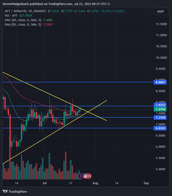 Meanwhile, CoinMarketCap indicated that the altcoin’s price rose 0.74% over the past 24 hours. As a result, APT was changing hands at $7.68 at press time. The cryptocurrency also strengthened against the market leaders Bitcoin (BTC) and Ethereum (ETH) by 0.48% and 1.67% respectively. This meant that 1 APT was worth 0.0002567 BTC and 0.004097 ETH.