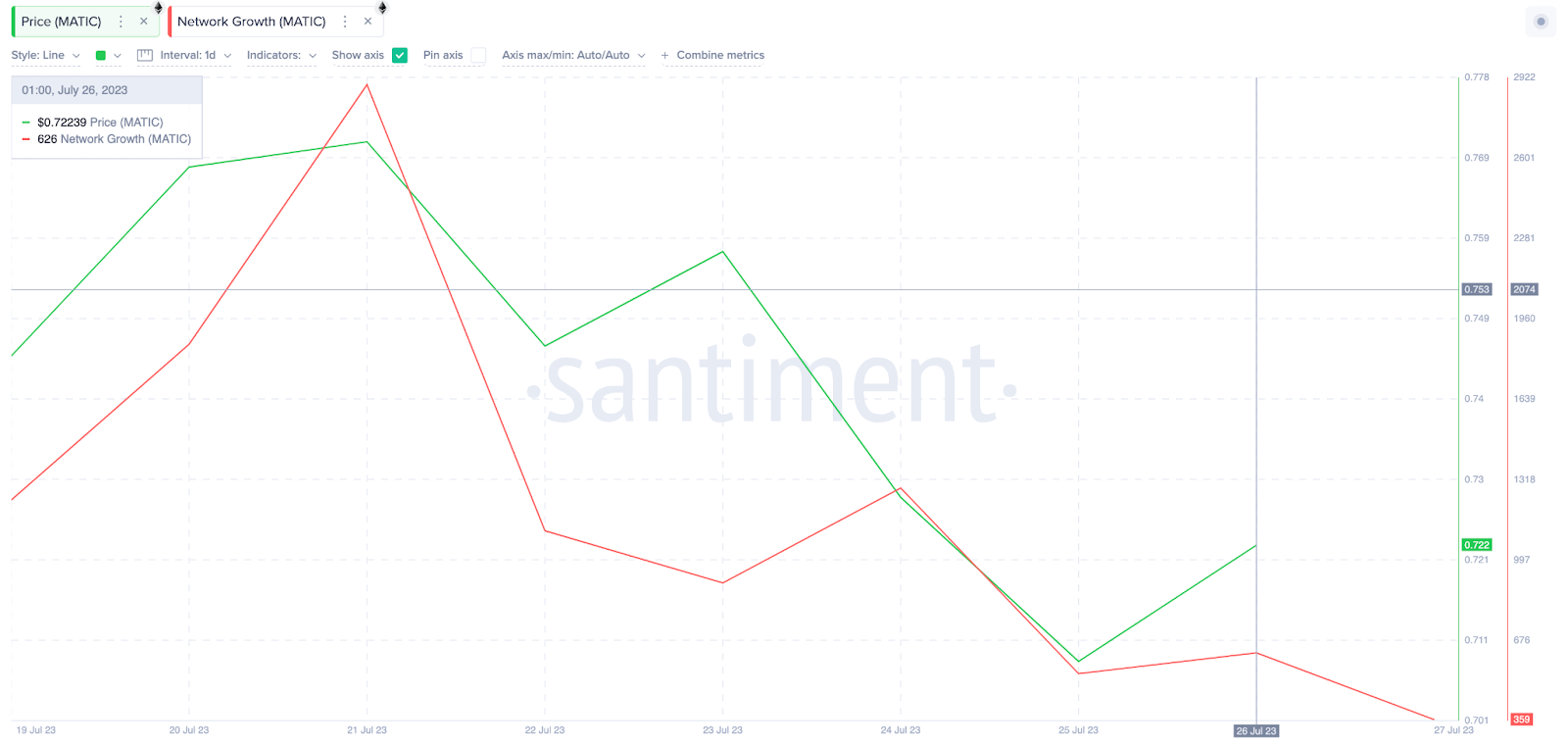 The Network Growth data compiled by Santiment shows that on July 20, investors opened 2,893 new MATIC wallet addresses. But by the close of July 26, it had dropped by a whopping 78% to just 626 new addresses.