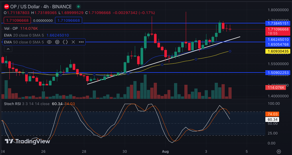 According to the OP/USD 4-hour chart, the support level increased from $1.50 on July 30 to $1.65 on August 3. Consequently, this has resulted in the formation of a bullish market structure. Till the time of writing, demand had outweighed the short/sell attempt close to $1.73.