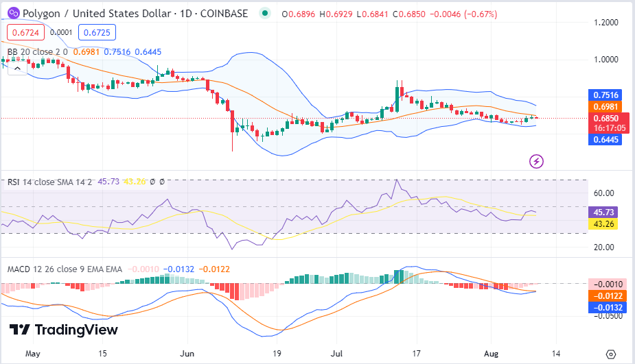 MATIC’s volatility levels are also stable as the Bollinger bands maintain a close distance from each other as the RSI moves above its average line, indicating a bullish trend on Polygon as the MACD indicator also moves in the red zone as it approaches a shift above its average line.