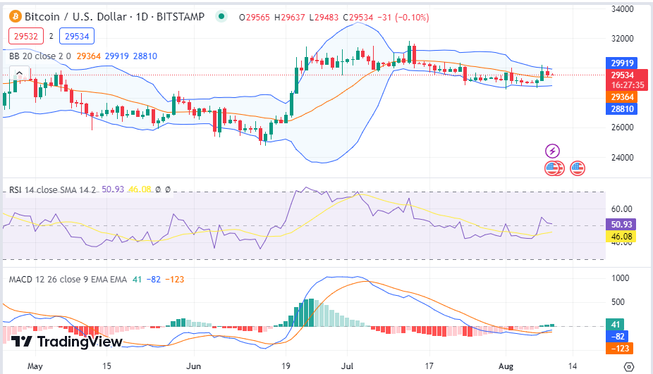 The Bollinger bands are still converging, indicating that the volatility of Bitcoin is decreasing. The Relative Strength Index (RSI) is now above its average level, showing the effort by bears for market dominance as the MACD also now moves in the green zone.