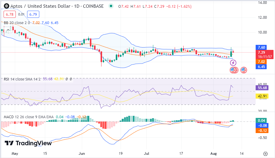 APT is also making a tremendous session today as the asset now trades 9.4% above its previous 24-hour price te trading volume saw a massive 790% surge within a day of trade to take it to $774M as APT now holds a spot price of $7.31.