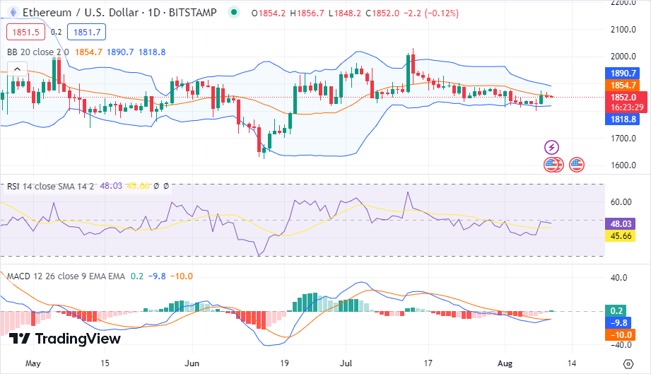 Ethereum (ETH) has also started on slight bearish activity, as the asset now sits on a drop of 0.36% within a day of trading to take it to $1852 as the trading volume dropped by 28% to take it to $4.7B as of press time. ETH’s volatility levels are also slowly decreasing as the Bollinger bands maintain a relatively close distance.