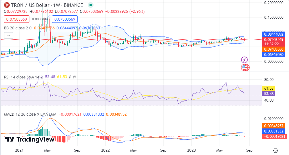 TRX has also had a slow week as the asset now trades 3.2% below its previous 24-hour price as the asset holds a spot price of $0.07494, while the market cap stood at $6.7B as the trading volume stood at 137M.