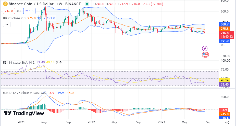 BNB has also had a bearish week as the asset trades 9.9% below its previous 7-day price. The asset now holds a spot price of $216 with a market cap of $33.3B, as the trading volume stood at $442M as of press time.