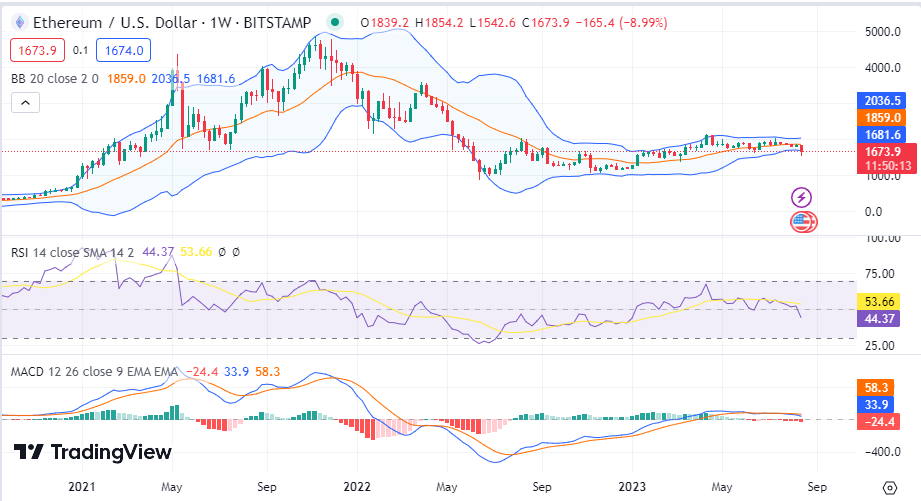 Bitcoins volatility for the week has been relatively stable as the Bollinger bands move close to each other. However, BTC’s relative strength indicator is moving below its average line, indicating a bearish trend on BTC as the MACD indicator hovers at a neutral position, showing the struggle between bulls and bears over the week for market dominance.