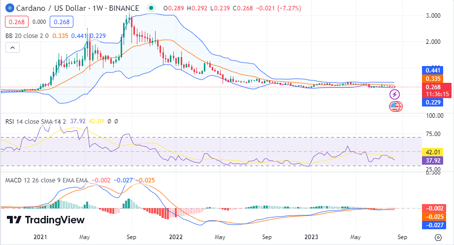 ADA has also had a slow week as the asset now trades 7.7% below its previous 7-day price, as the asset now holds a spot price of $0.26 with a trading volume of $9.3B as the trading volume stood at $151M.