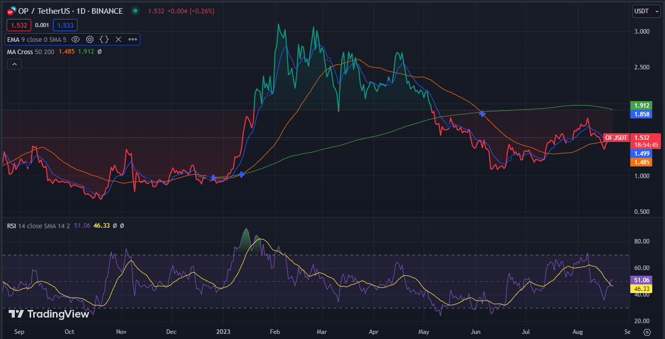 Further, the recent development is the convergence of Optimism’s (OP) 50-day moving average (50MA) towards its 200-day moving average (200MA). This trend sentiment finds positive momentum in Optimism’s (OP) current positioning above its 50-day exponential moving average (50-day EMA). Moreover, a crucial metric, the Relative Strength Index (RSI), is presently situated at 51, indicating a new correlation in the price momentum.