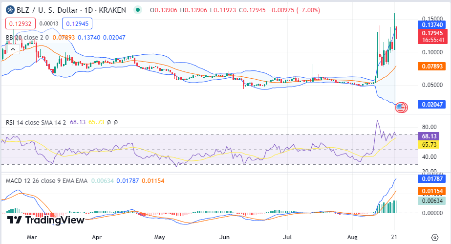 BLZ’s volatility levels are now spiking as the asset’s Bollinger bands diverge from each other. At the same time, the RSI moves above its average line around the overbought region showing great bull dominance as the RSI also moves in the green zone.