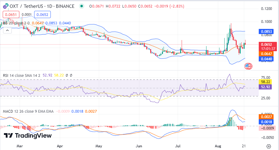 OXT is having a tremendous session today as the asset now trades 6.5% above its previous 24-hour price, as the trading volume now sits on an increase of 137% within a day of trading to now sit at $37.5M.