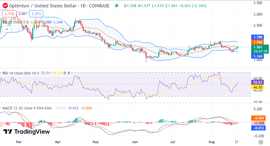 OP is also having a bullish session today as the asset trades 5% above its previous 24-hour price, as it holds a spot price of $1.56, as the trading volume saw a 107% spike within a day of trade as it now stands at $142M.
