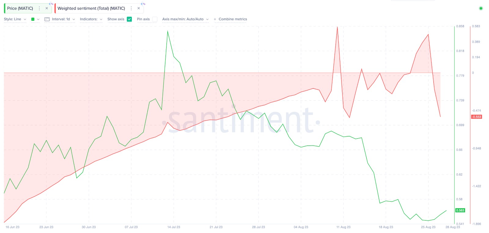 After weeks in the doldrums, social sentiment surrounding MATIC price has recently flipped negative. According to data culled from Santiment, MATIC Weighted Sentiment began to trend downward around August 25. As of August 28, it currently sits around -0.55.