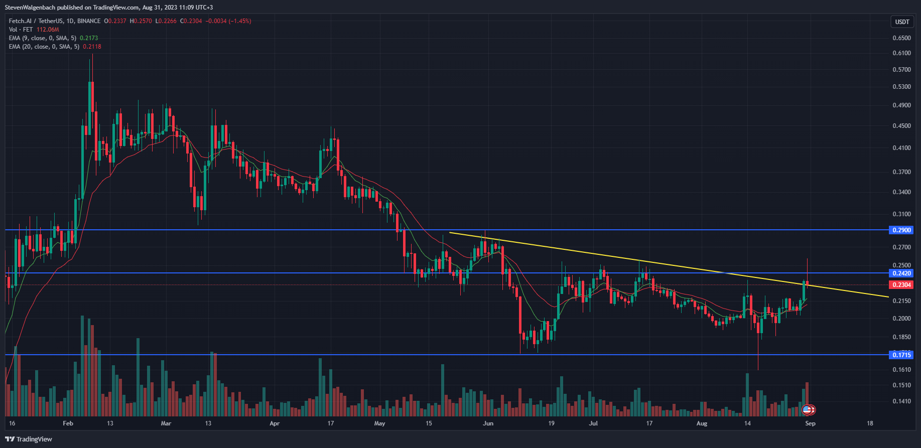 Once FET’s price manages to breach the $0.2420 mark, this could pave the way for further upward movement, potentially reaching the next notable resistance level around $0.290 within the upcoming weeks. Conversely, if there is a rejection from the aforementioned multi-month trend line, there is a possibility that the altcoin may retest the support level at $0.1715.