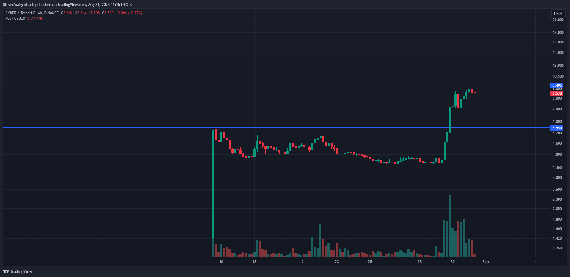 Meanwhile, CYBER saw its price rise by an impressive 12.62% throughout the past day of trading. As a result, the altcoin’s price stood at $8.70 at press time. This positive daily performance boosted the altcoin’s remarkable weekly performance to +117.81% as well.