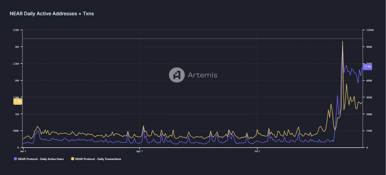 NEAR reported a record number of daily active addresses, with transactions exceeding 3.2 million and nearly 900,000 active wallets. This huge increase in user activity was primarily due to the Kai-Ching app, which launched in late August and has since attracted approximately 1.6 million monthly active users.