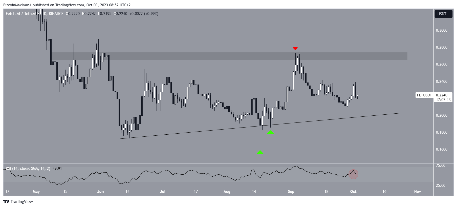 The FET price has increased alongside an ascending support trendline since June 2022. More recently, the price validated the line on August 17 and 22 (green icons). The touches created long lower wicks, considered signs of buying pressure.