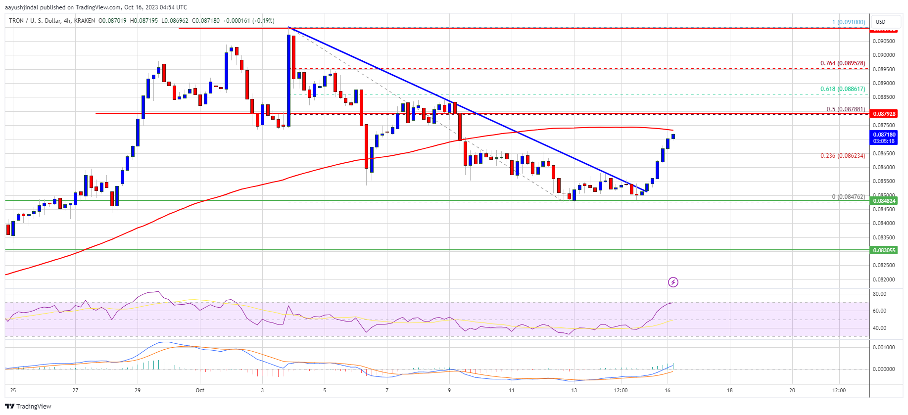 After facing a rejection near $0.0910, Tron price started a downside correction. TRX declined below the $0.088 and $0.0865 support levels. Finally, it found support near the $0.0850 zone.