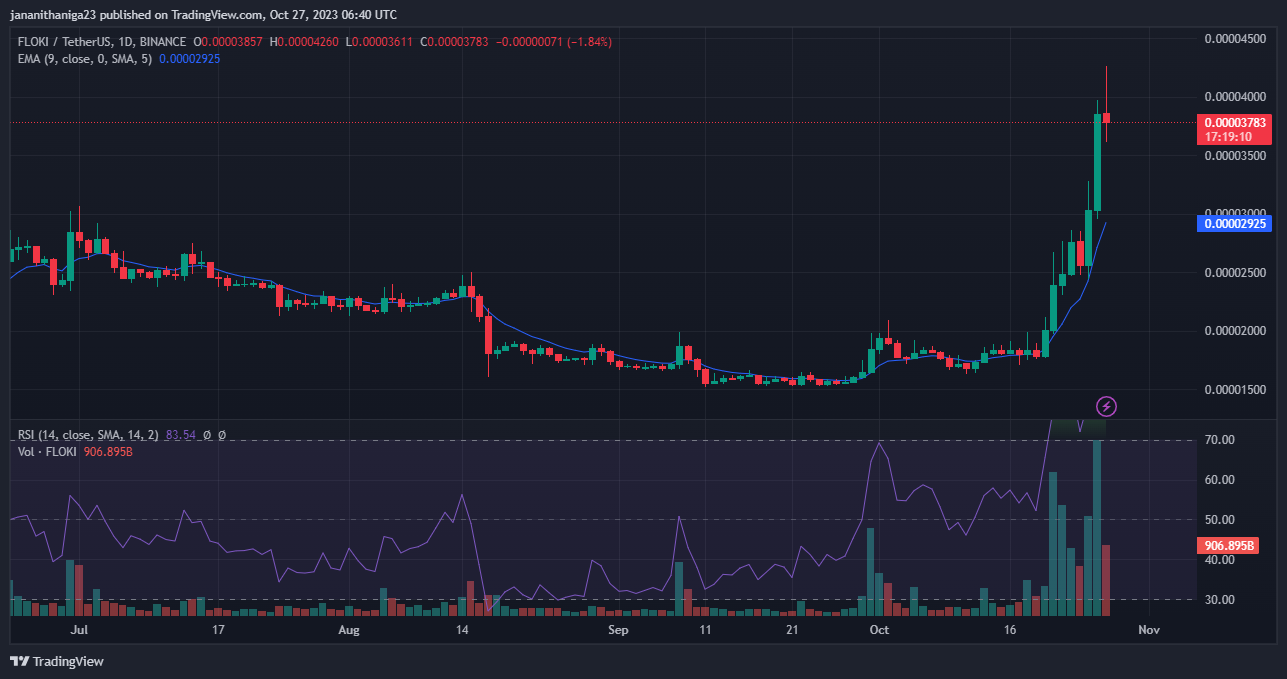 Floki, the popular memecoin, is the talk of the crypto token with its impressive performance and recent updates. It has recently reached a five-month high, trading at $0.00004074, marking a 24% increase over the past 24 hours. In a week’s time, it has witnessed an extraordinary surge of 105%.