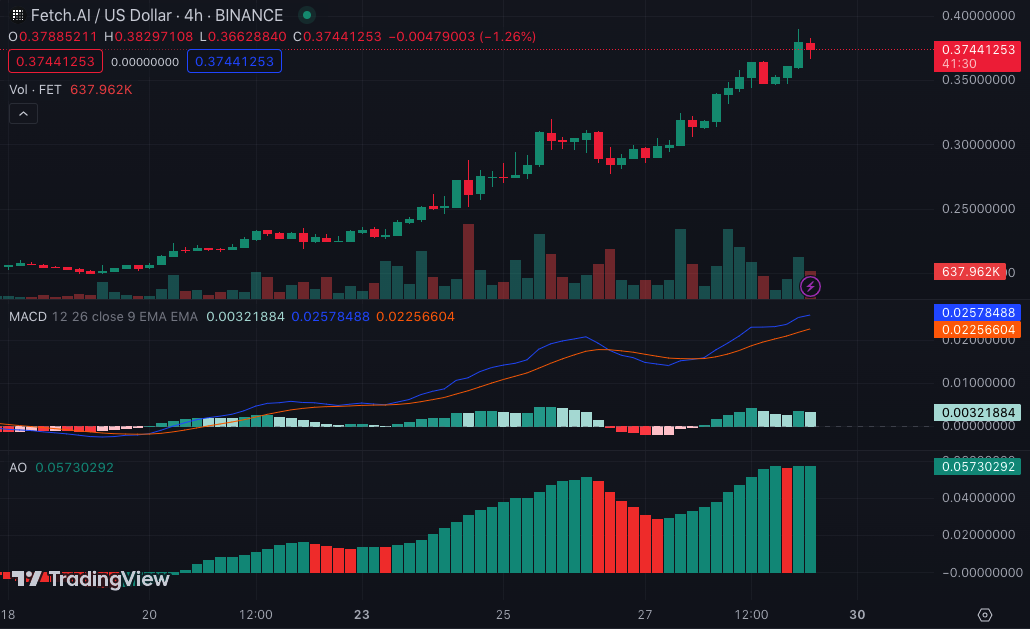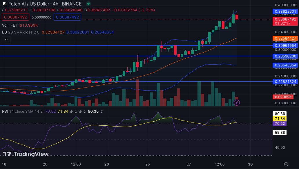 In a very bullish circumstance, FET may jump beyond $0.40. But this would require increased buying pressure. With increasing volatility shown by the Bollinger Bands (BB), FET could be ready for a significant upswing.