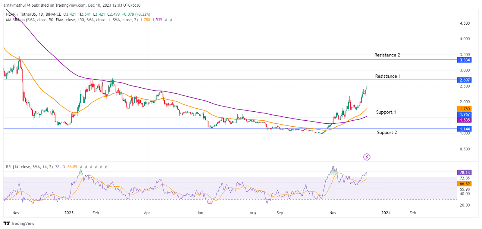 Similarly, the resistance levels are at $2.69 and $3.33. The RSI has already reached the oversold level, highlighting market greed. A sell-off is expected. However, the 50 day and the 150 day EMA have done a golden crossover with each other, indicating positive momentum. The price prediction for the NEAR coin will be bearish after it reaches its immediate resistance level.
