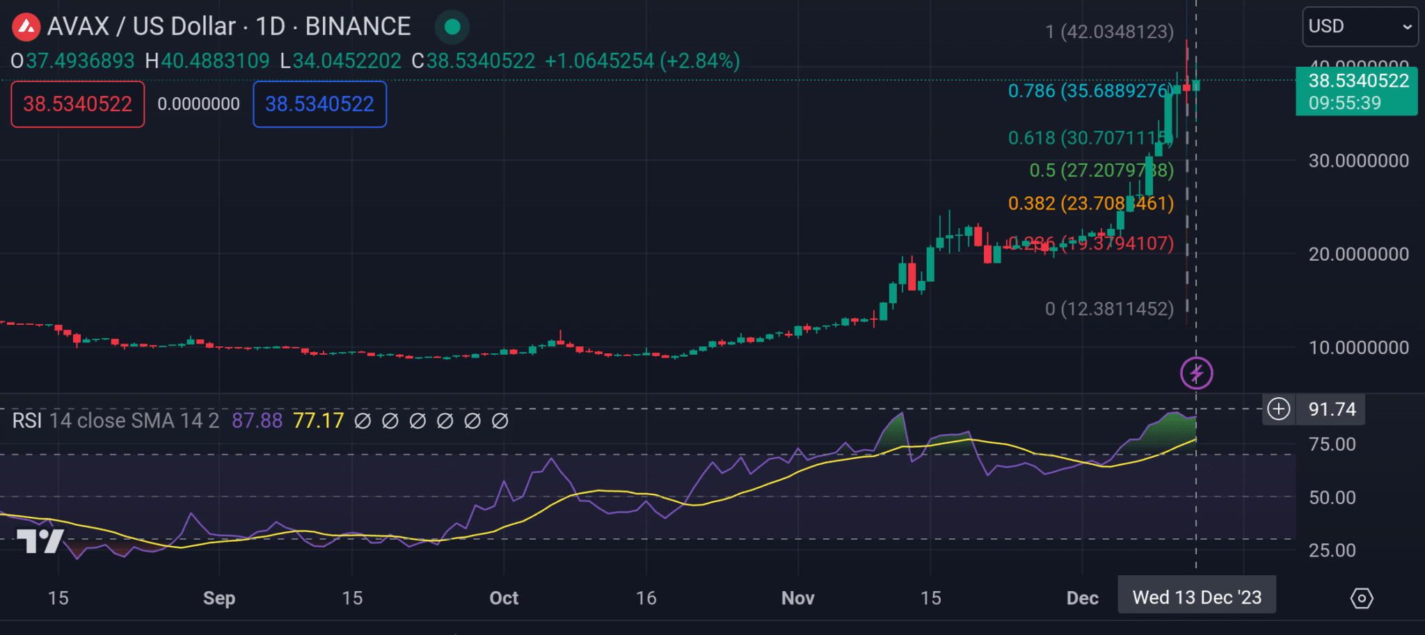 Amid the upsurge, Avalanche has now slipped into overbought territories, with a daily Relative Strength Index (RSI) of 87.88. This high RSI suggests that the recent gains are relatively strong compared to losses, and there’s a possibility of a potential reversal or a correction in the near term.