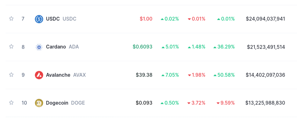 Avalanche ($AVAX) has slipped into the top 10, overtaking Dogecoin (DOGE) as the ninth largest cryptocurrency by market cap amid an impressive 50% rally in seven days.