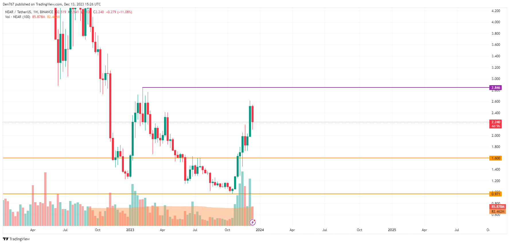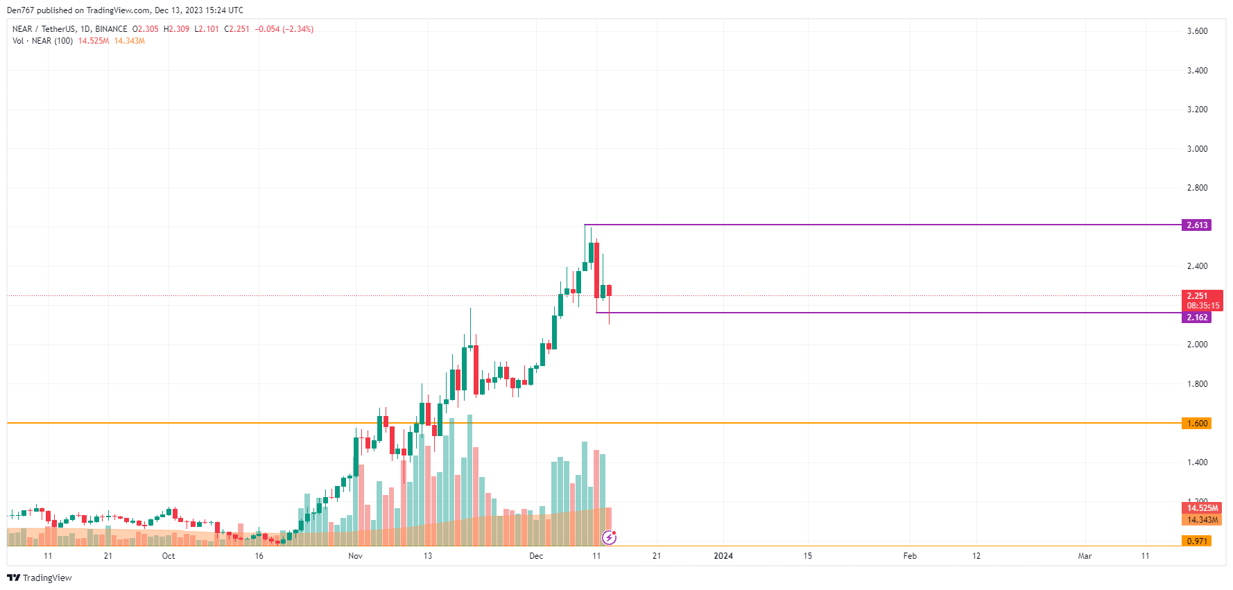 On the bigger time frame, the rate of NEAR has made a false breakout of the support level of $2.162. If today's bar closes far from it, one can expect a bounce back to the $2.4 area soon.