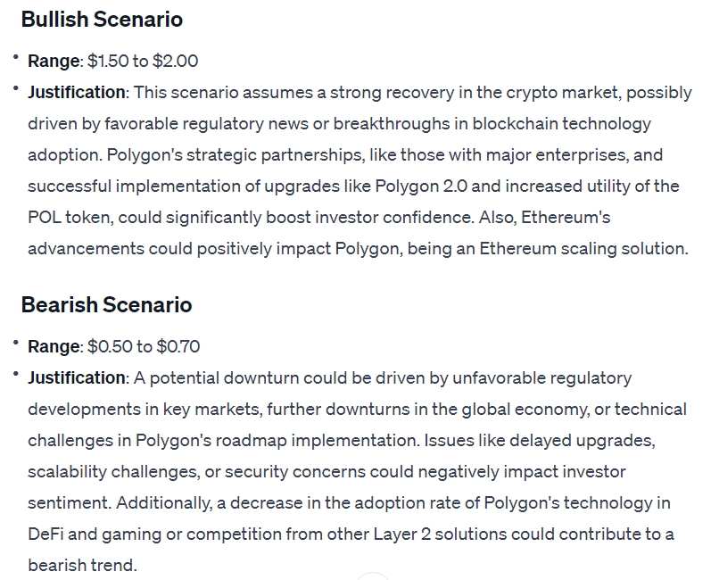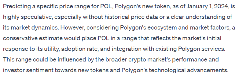 ChatGPT was generally positive toward POL’s potential when asked but refused to make a price range prediction. According to the AI, POL’s success will depend on the overall state of the Polygon ecosystem, and there is simply not enough data to offer anything other than an estimate that would be even more speculative than the educated guesses ChatGPT is able to provide.
