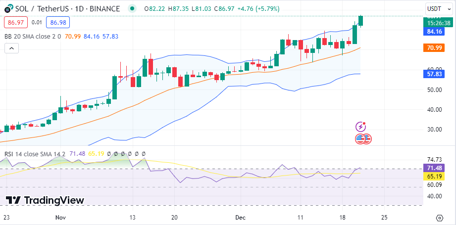 . The Relative Strength Index (RSI) is above the average line in the overbought region, showing bull dominance on the Solana price.