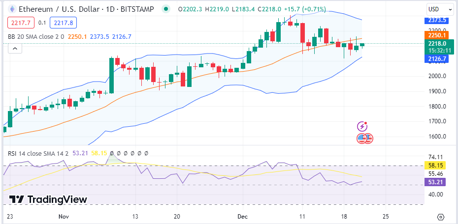 Ethereum (ETH) is also riding on slight bull activity, as the Ethereum price stood at $2,217 as of press time after recording a daily increase of 0.22% and a weekly drop of 2.7%. As a result of the Ethereum price, the token’s trade volume jumped by 27% during the same period and is presently at $12.9B.
