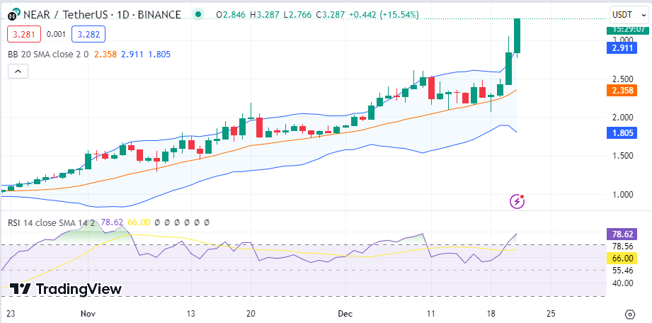 The Bollinger bands are diverging, showing high volatility levels on the NEAR price. The Relative Strength Index (RSI) is above the average line in the overbought region, showing bull dominance on the NEAR price.