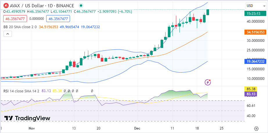 The Bollinger bands are diverging, showing high volatility levels on the Avalanche price. The Relative Strength Index (RSI) is in the overbought region but moving below the average line, showing bear activity on the Avalanche price despite the rise.