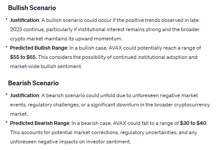 When making its prediction, ChatGPT took into account the various developments pertaining to Avalanche, and boosting its overall ecosystem, as well as its recent price movements, and initially estimated that $AVAX would find itself somewhere between $50 and $60.