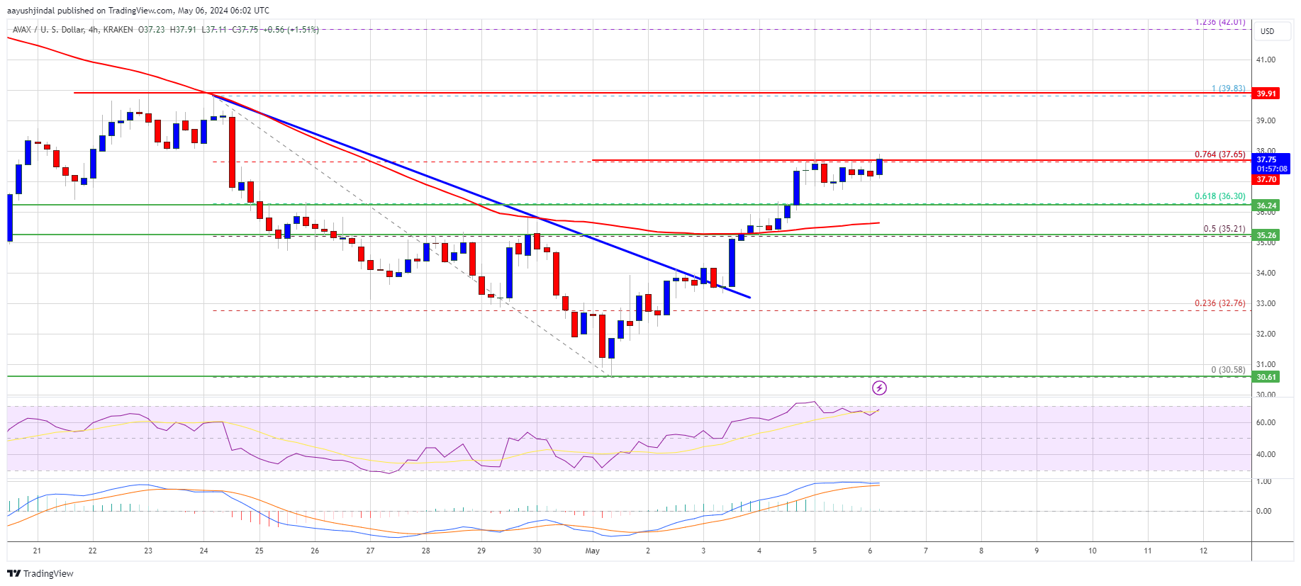 $AVAX price is now trading above $36.50 and the 100 simple moving average (4 hours). On the upside, an immediate resistance is near the $37.65 zone or the 76.4% Fib retracement level of the downward move from the $39.83 swing high to the $30.58 low.