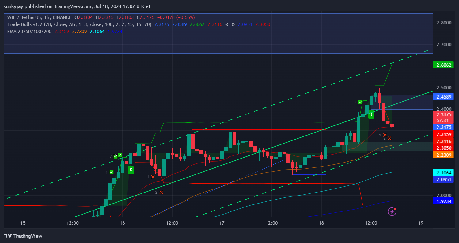 In the early hours of today, Dogwifhat surged to an impressive $2.49, making it one of the top-performing tokens of the day. However, this surge was followed by a slight correction, causing the price to dip slightly. As of the time of writing, WIF is trading at $2.34, reflecting a 7.91% increase over the last 24 hours. Despite the minor correction, this price movement indicates strong investor interest and confidence in the token.