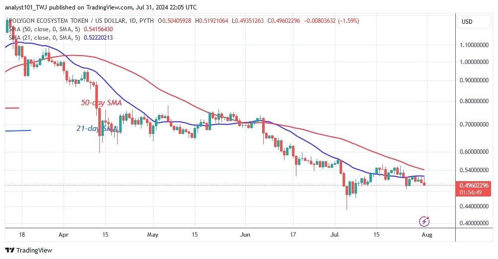Coinidol.com reported in July 26 that Polygon's upward correction has stalled at $0.55 or the 50-day SMA resistance. The cryptocurrency has been capped at its recent high due to resistance.