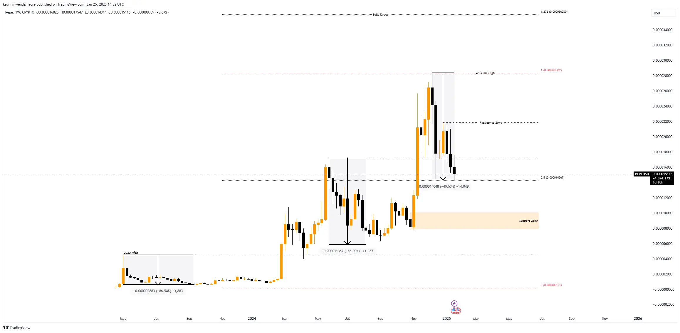 Historical data from early 2023 and mid-2024 indicate that bullish rallies followed similar corrections. For instance, after a 66% decline in mid-2024, PEPE cryptocurrency rebounded strongly, generating an intensified gain of over 380% to its ATH within a short period.