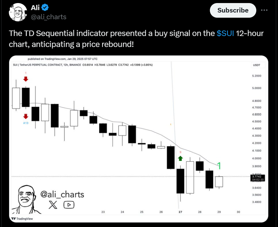 The TD Sequential indicator on the Sui (SUI) price 12-hour chart has shown a buy signal that hints at a price bounce.