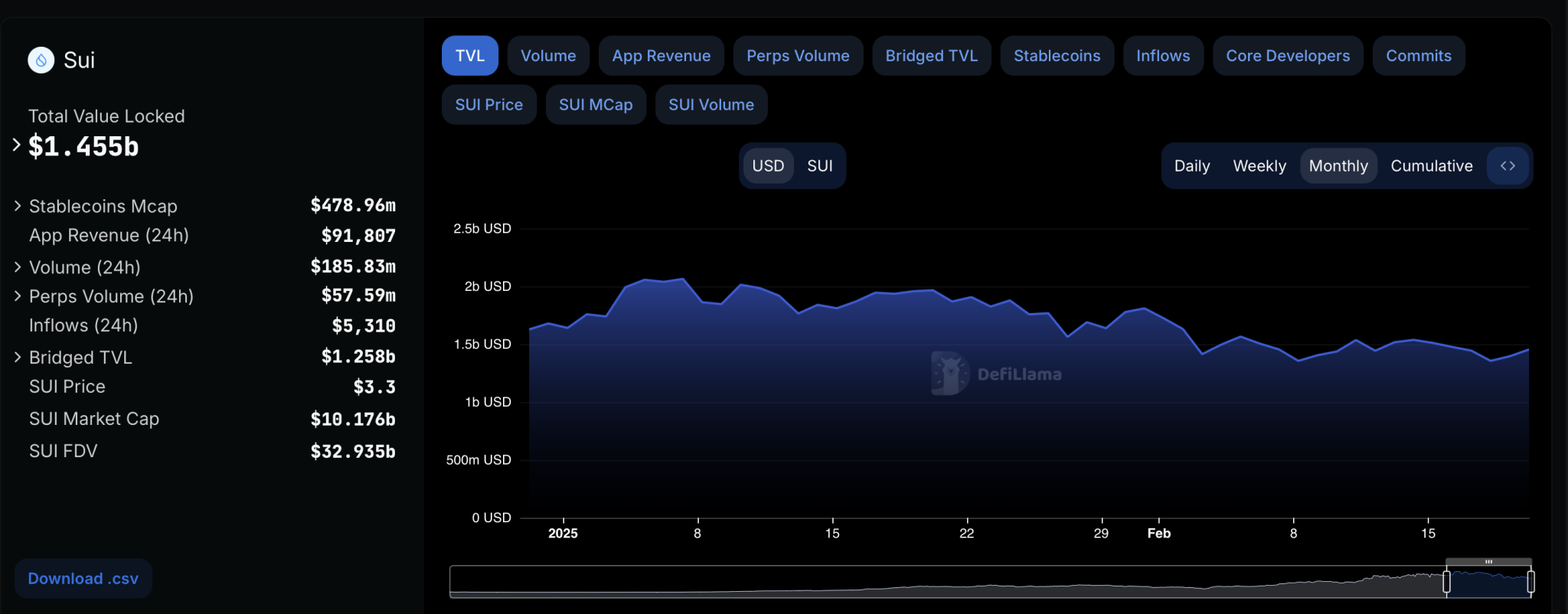 On the DeFi side, the total value locked (TVL) of the SUI network remains at $1.455 billion. This marks a significant decline since the beginning of 2025.